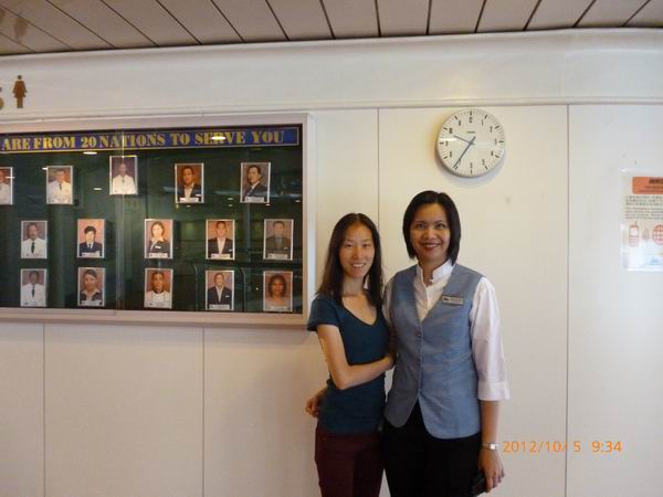 2012年10月4日,我司杨艳经理受邀参观丽星邮轮双鱼星号,该轮航线香港-公海-香港。亲身体验邮轮生活并与船上领导交流邮轮乘务员工作事宜,合影留恋。