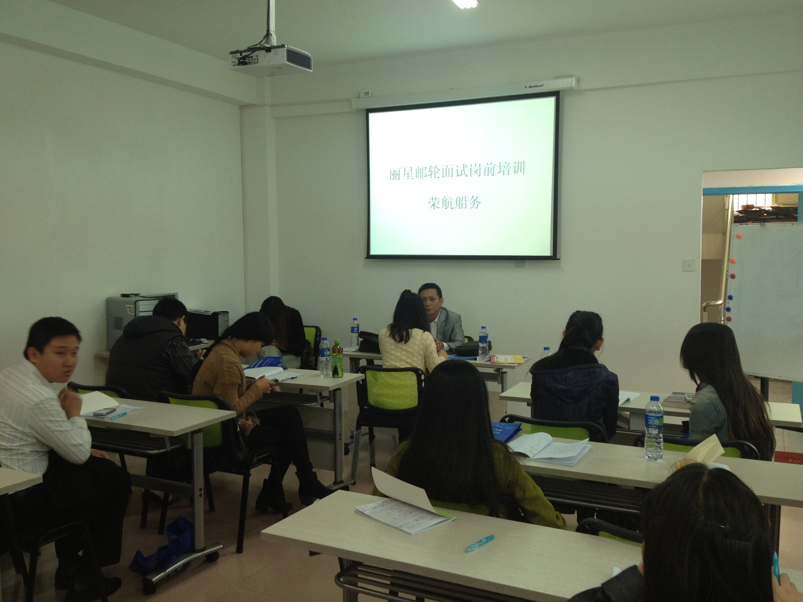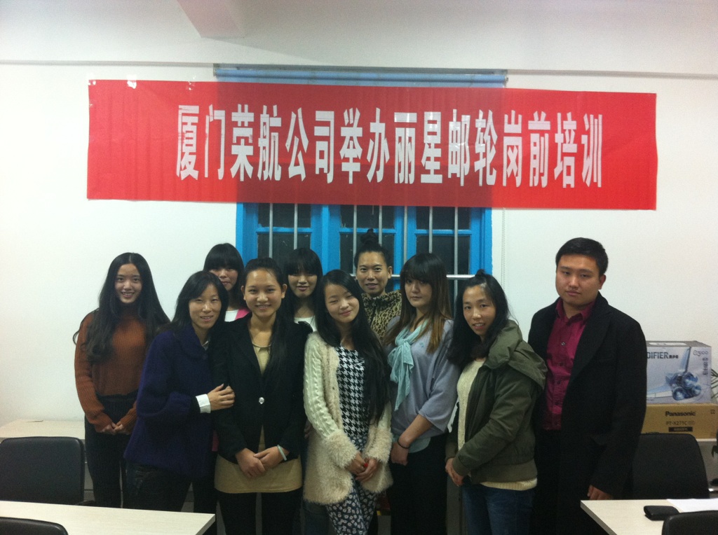 我司于2013年12月9日至14日举办为期4天的丽星邮轮面试岗前培训。此次培训主要是提高学员的口语能力,增加学员的面试自信心。参加此次培训学员共计11人,分别来自福建、江西、江苏、四川等地。此次培训的授课由杨艳、Chelsea以及Jack3名老师担任。杨艳在我司邮轮部从事多年乘务派遣工作;Chelsea留学澳洲四年回国后曾任职韦博国际英语学校专业英语老师;Jack曾服务于意大利歌诗达邮轮大西洋号,任职大副。