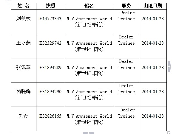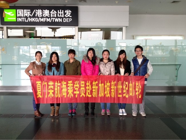 2014年2日28日,我司刘秋绒等五名海乘学员于厦门高崎国际机场出境,前往马来西亚登新加坡新世纪邮轮 M.V AMUSEMENT WORLD.祝愿她们工作顺心、前程似锦。