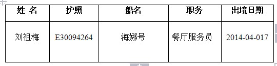 2014年04月17日,我司海乘学员刘祖梅于北京国际机场出境,前往台湾登丽星邮轮海娜号。祝愿她工作顺心、前程似锦。