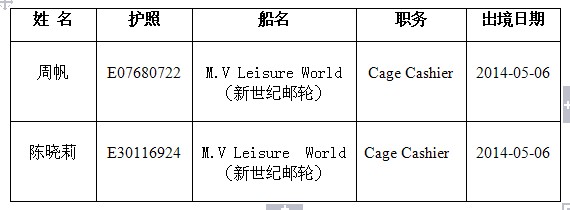 2014年05月06日,我司周帆、陈晓莉两名海乘学员于厦门高崎国际机场出发,经广州前往新加坡登新世纪邮轮LEISURE WORLD。祝愿她们工作顺心、前程似锦。