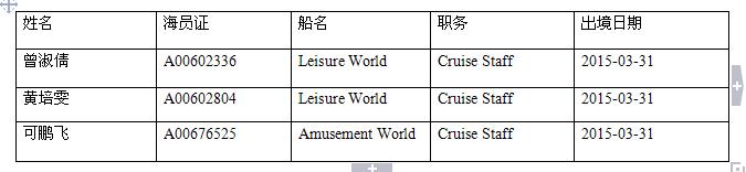 2015年03月31日,我司曾淑倩、黄培雯两名海乘学员于厦门高崎国际机场出发,前往新加坡登新世纪邮轮LEISURE WORLD。我司可鹏飞海乘学员于厦门高崎国际机场出发,经广州前往马来西亚登新世纪邮轮AMUSEMENT WORLD。祝愿他们工作顺心、前程似锦。