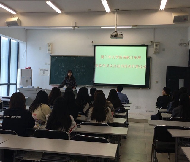 2019年5月6日上午,我司举办厦门华天学院荣航订单班2018级高铁学员安全证书培训开班仪式,出席领导有:荣猛董事长、高炳忠副院长、陈中凤教学秘书等,会上高副院长给全体学员强调职业培训课程的重要性及课程考核等相关要求。