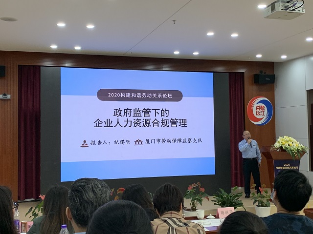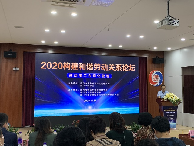 2020年11月27日,我司杨艳经理参加由厦门市人力资源和社会保障局、厦门律师协会共同主办的“2020厦门构建和谐劳动关系论坛”。论坛主题:劳动用工的合规化管理;论坛地点:劳动力大厦一楼梯形会议厅;论坛发言人:厦门市人社局一级调研员吴目国、厦门市总工会基层工作部部长一级调研员蒋丽琴、厦门市劳动保障监察支队支队长纪锡坚、厦门律师协会曾春华律师等。