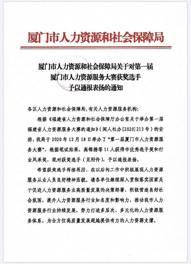 根据《福建省人力资源和社会保障厅办公室关于举办第一届福建省人力资源服务大赛的通知》(闽人社办[2020]213号)的安排,厦门市人力资源与社会保障局于2020年12月18日在厦门市人才服务中心A座三楼人才培训研修中心教室举办了“第一届厦门市人力资源服务大赛”,根据考核结果,我司杨艳经理荣获“第一届厦门市人力资源服务大赛”行业风采奖,对此我司予以通报表扬。